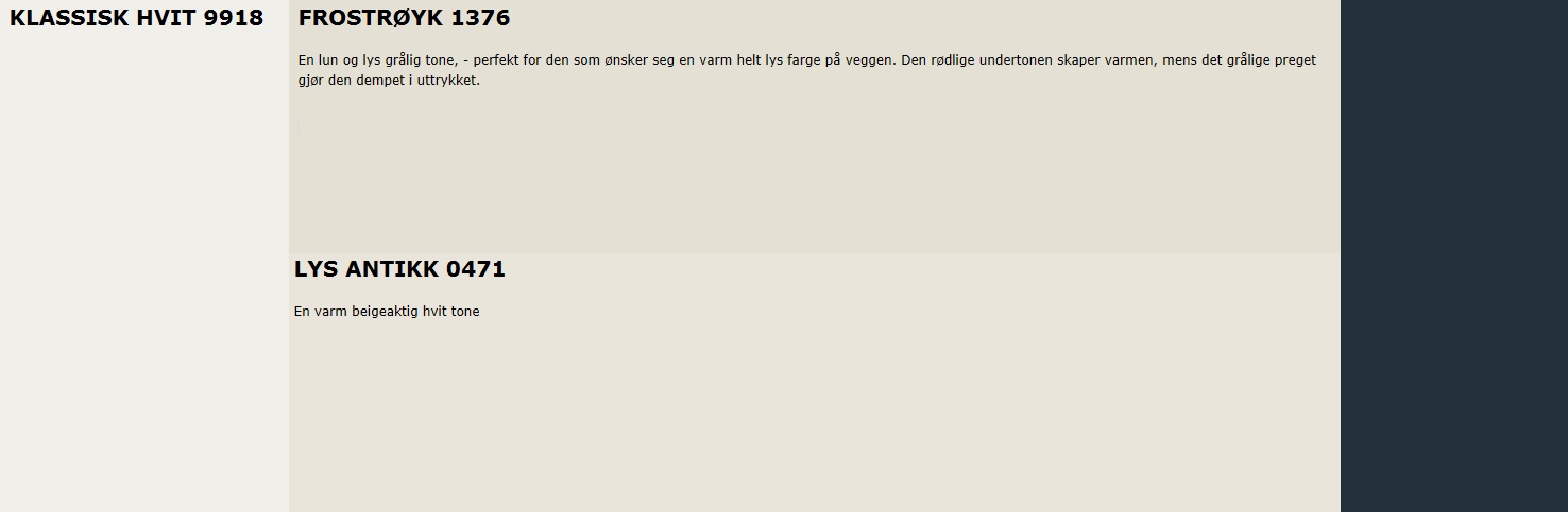 7236 chi 0401 g42y 8282 hvit pepper 1102 g95y 1929 muskatnøtt 4806 y38r 9918 klassisk hvit s0500 n 8401 kritthvit 1002 g78y 2363 solid s6005 y50r 1928 sommersne 1102 y10r 8395 hvit komfort 0802 g94y 1359 macchiato s2005 y40r 8394 hvit poesi 1102 g60y 1140 sand s2005 y30r. 9918 klassisk hvit er kridhvid. 1001 egghvit og 1453 bomull bliver lige en tand for gule til den dæmpede beige nuance.