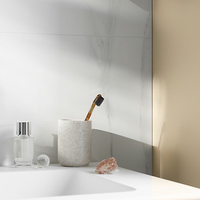 Baderomsplater hvit marmor. 2 976 m 2 paneler merke. Veggsystemet kan monteres opp til fem ganger raskere enn fliser. Berry alloc leverandørens fargenavn.